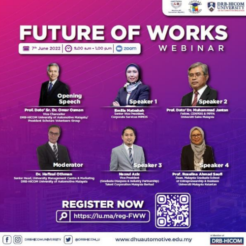 Webinar: Future of Works was a webinar session organized by Malaysian Graduate School of Entrepreneurship and Business. It explored the trends and challenges of the changing nature of work in the digital era. The webinar featured speakers from various sectors who shared their views and recommendations on how to prepare and adapt for the future of works.