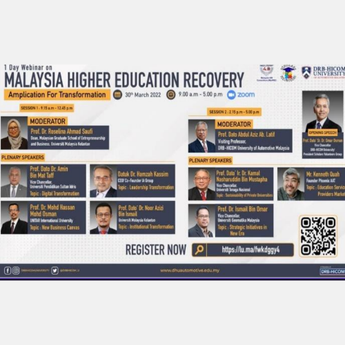 1 Day Webinar as Malaysia Higher Education Recovery: Amplication For Transformation was an online event that aimed to discuss and explore the issues and challenges faced by the higher education sector in Malaysia due to the Covid-19 pandemic. The event featured speakers from various stakeholders such as the Ministry of Higher Education, the Malaysian Qualifications Agency, the Higher Education Leadership Academy, and the public and private universities. The event co.. Read More..