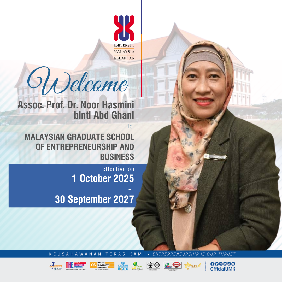 We are delighted to welcome Assoc. Prof. Dr. Noor Hasmini binti Abd Ghani to the Malaysian Graduate School of Entrepreneurship and Business (MGSEB), Universiti Malaysia Kelantan.