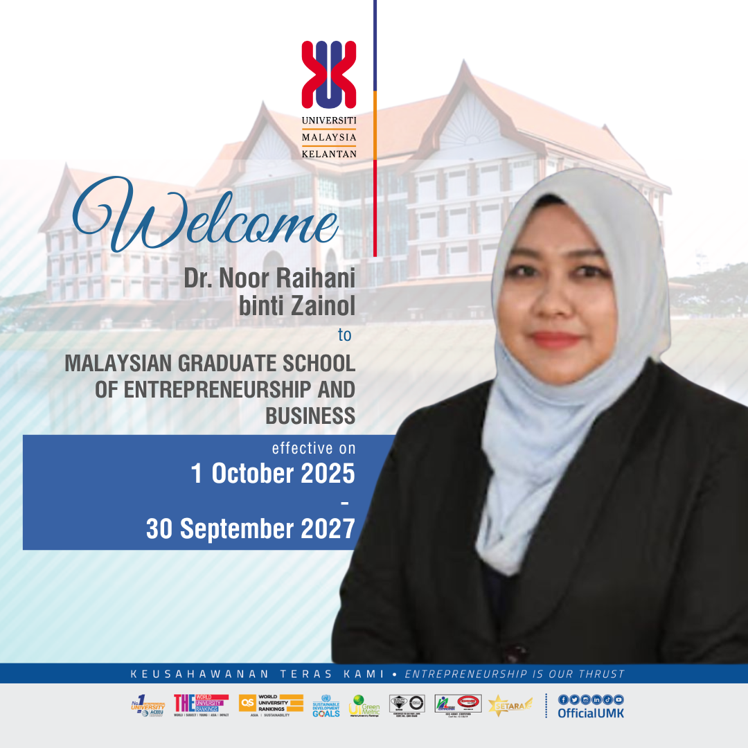 We are delighted to welcome Dr. Noor Raihani binti Zainol to the Malaysian Graduate School of Entrepreneurship and Business (MGSEB), Universiti Malaysia Kelantan.
