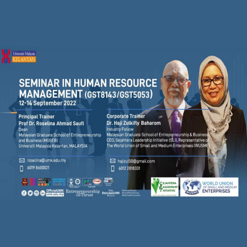 Seminar in Human Resource Management was a seminar session organized by Malaysian Graduate School of Entrepreneurship and Business. It was conducted by Prof Dr. Roselina Ahmad Saufi, the Dean of MGSEB and a corporate trainer, Dr. Haji Zulkifly Baharom, an industry fellow of MGSEB. The seminar discussed various aspects of human resource management and how to apply them in the workplace.