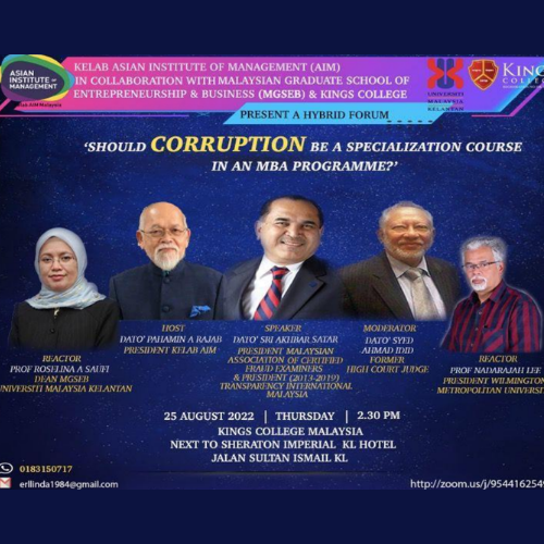 MGSEB presented a hybrid forum on the topic "Should Corruption Be A Specialization Course In An MBA Programme?" The forum was held both online and offline and involved speakers and participants from various backgrounds and perspectives. The forum aimed to stimulate critical thinking and debate on the issue of corruption and its implications for business education and practice.
