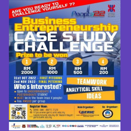Business Entrepreneurship: Case Study Challenge was a competition organized by Malaysian Graduate School of Entrepreneurship and Business. It invited students from various universities and colleges to analyze and solve real-life business problems faced by entrepreneurs. The competition aimed to enhance the students¿ entrepreneurial skills and mindset and to provide them with valuable feedback and mentorship from the judges and experts.